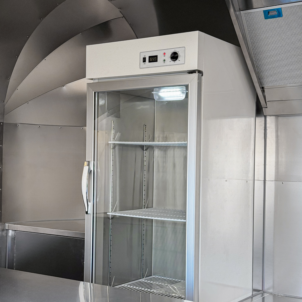 Hochwertiger Edelstahl-Innenausbau auf isoliertem Stahlrahmen, ausgelegt für hygienisches Arbeiten im professionellen Lebensmittelverkauf
