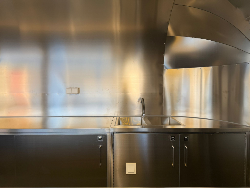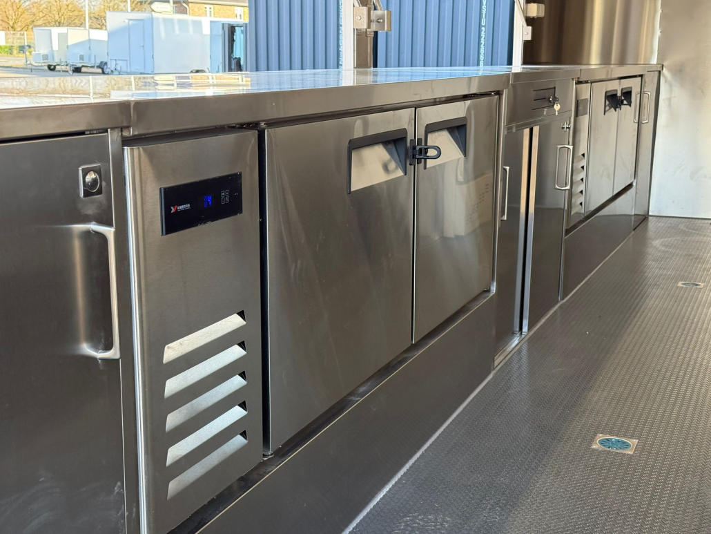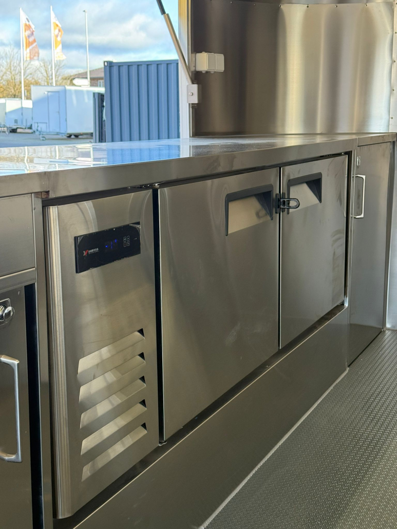 Ausstattung: 230 Volt Anschluss, Gefrierschrank, Kühlschrank, Sichtkühlschrank, Abzugsahaube, Hygienepaket,