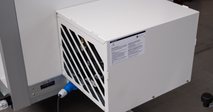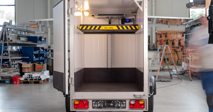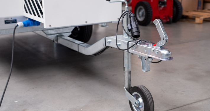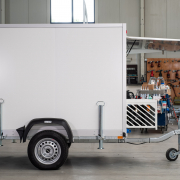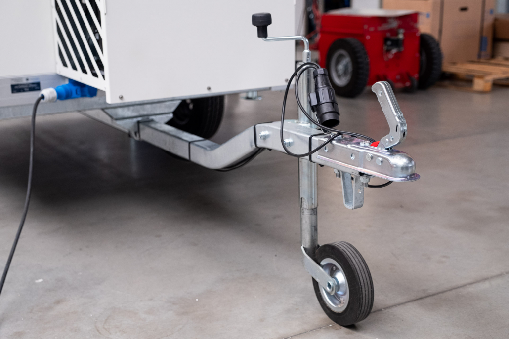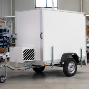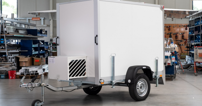 Kälteanlage SplittChill© mit elektrischer Abtauung und elektronischer Regelung in einem Kühlmaschinenkasten an der Stirnwand an der Deichsel montiert.
