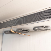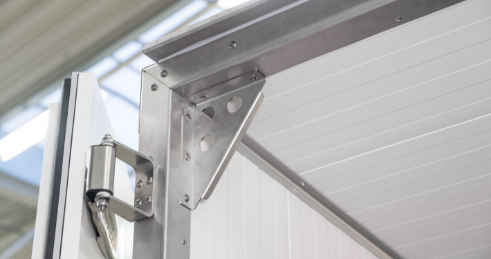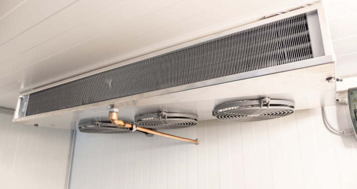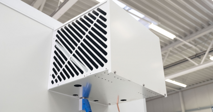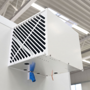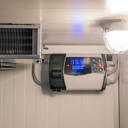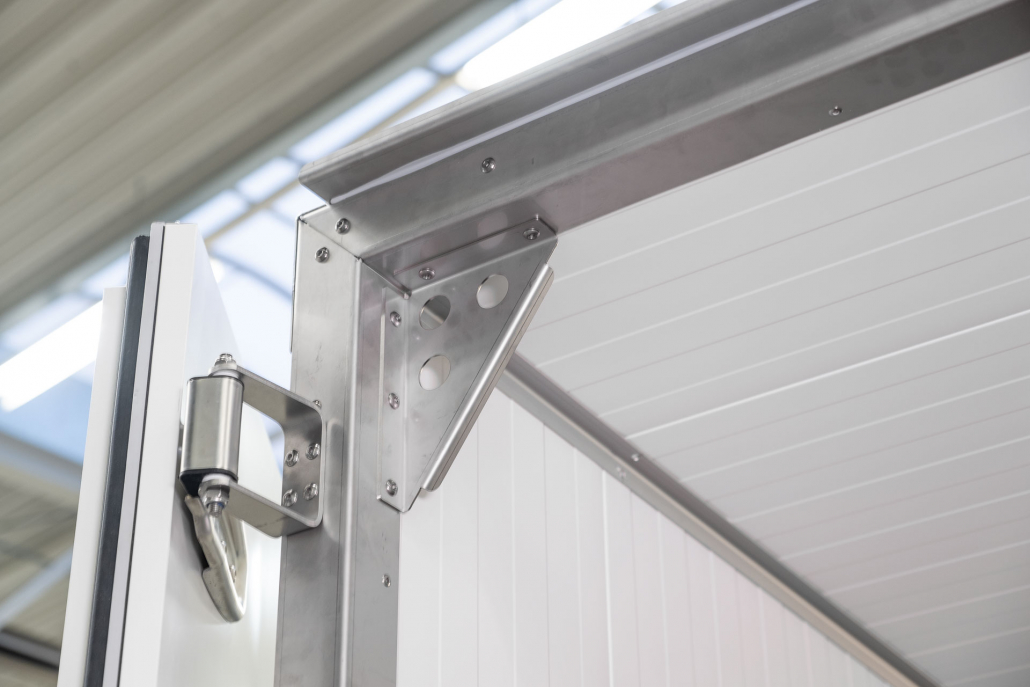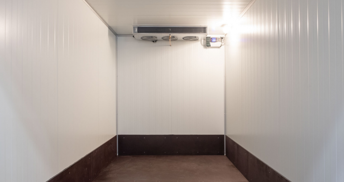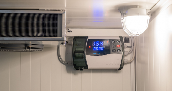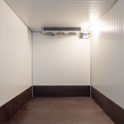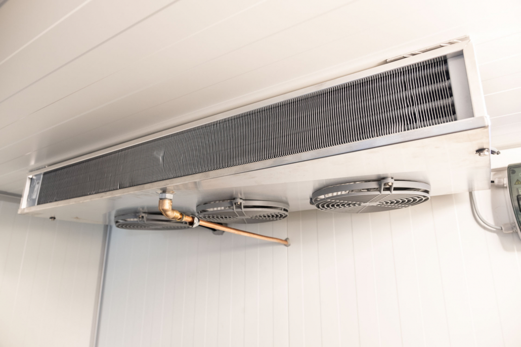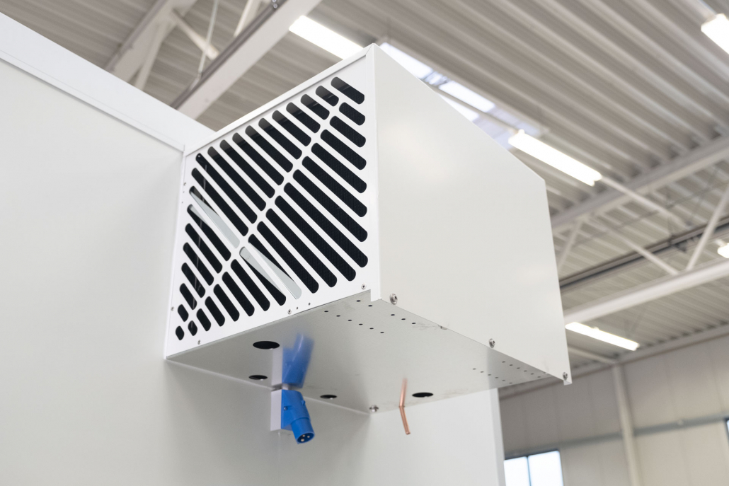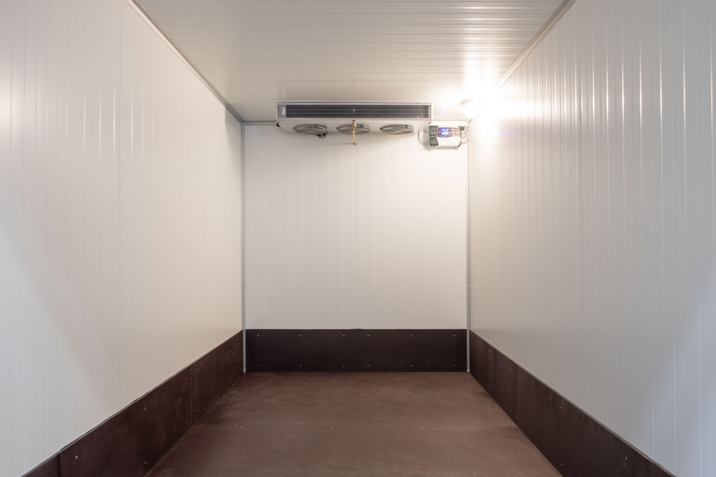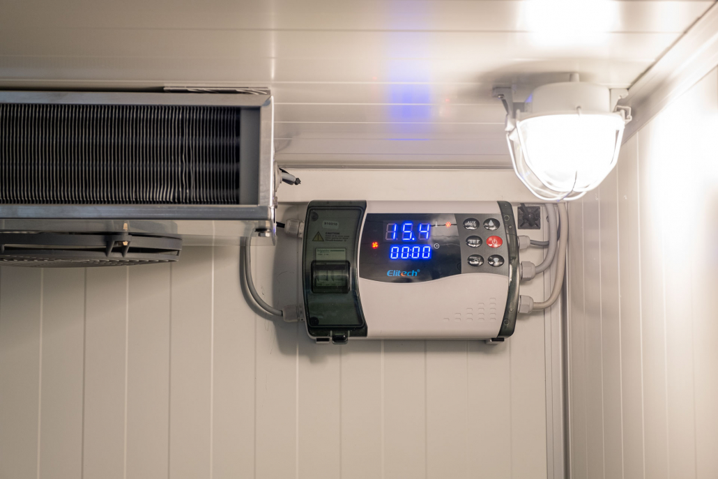 Kälteanlage SplittChill© mit elektrischer Abtauung und elektronischer Regelung in einem Kühlmaschinenkasten an der Stirnwand oben montiert.