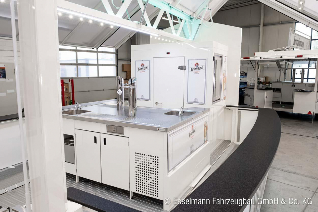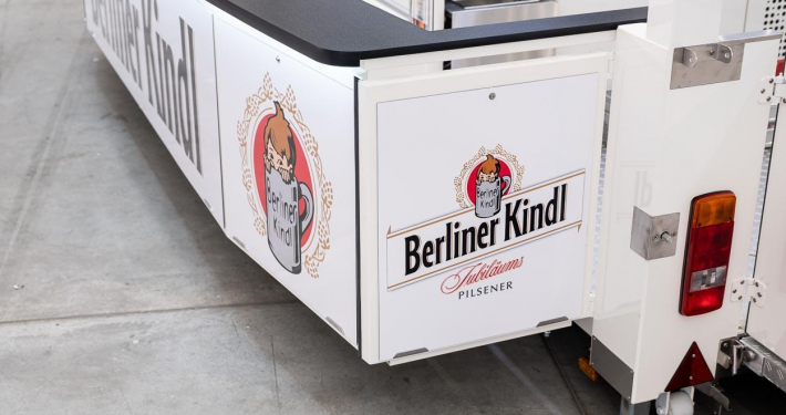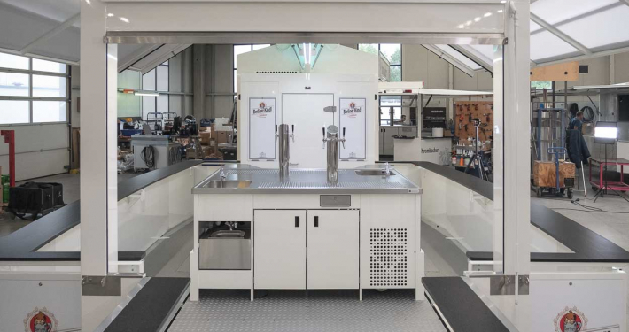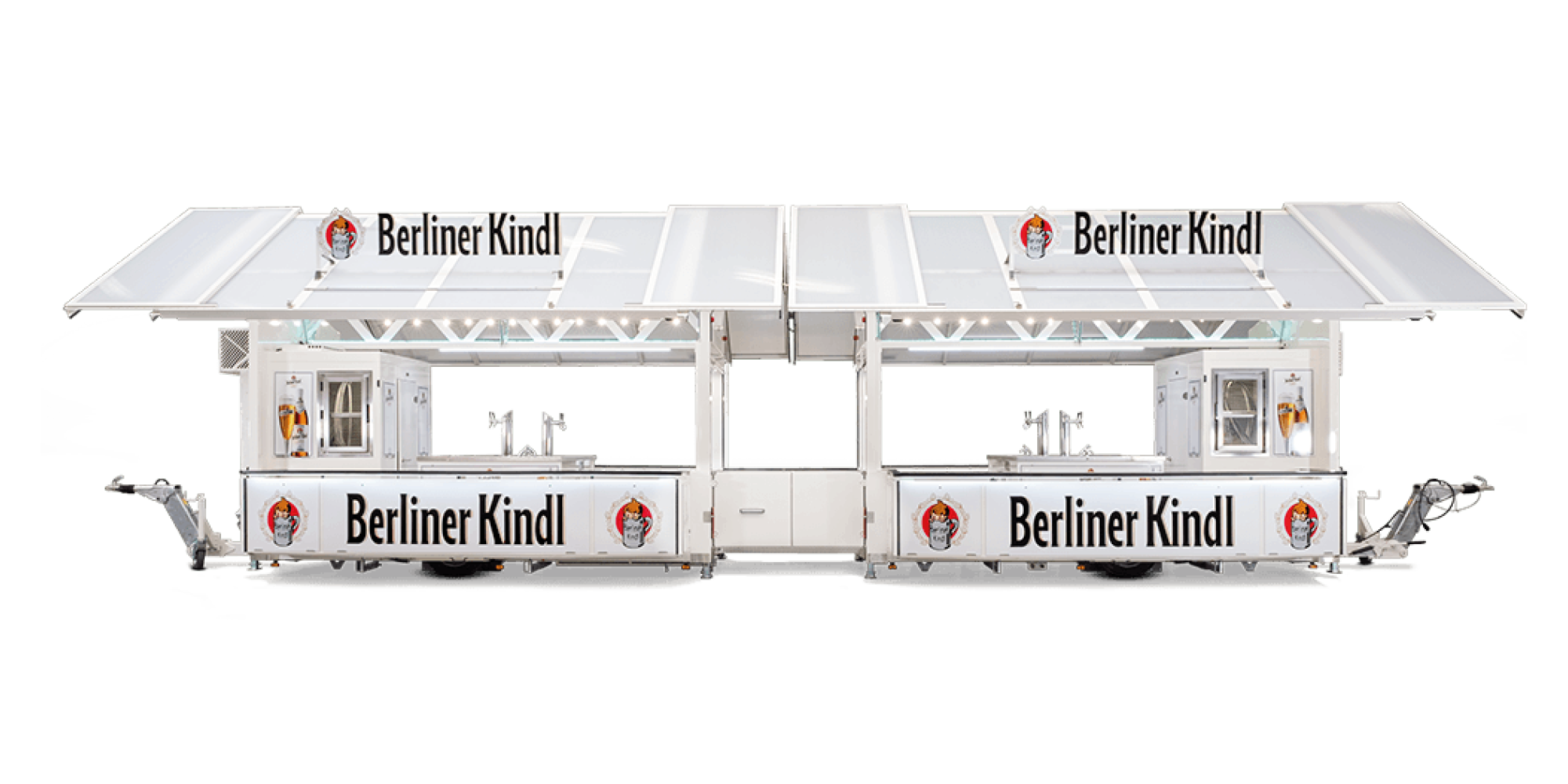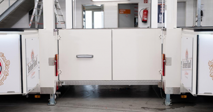 Beide Fahrzeuge verfügen über das markante Trifore-Dach, das für hohe Fernwirkung bei Tag und Nacht sorgt. In Kombination wirkt die Doppel8-Variante besonders imposant und zieht die Aufmerksamkeit von Besuchern schon aus der Ferne auf sich. Damit wird die Doppel8 nicht nur zum Ausschankwagen, sondern zum Eventfahrzeug und Markenbotschafter.